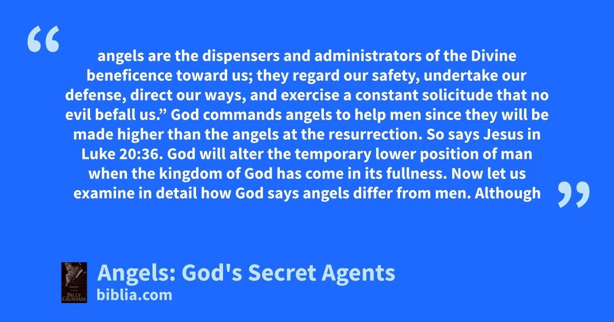 angels are the dispensers and administrators of the Divine beneficence toward us; they regard our safety, undertake our defense, direct our ways, and exercise a constant solicitude that no evil befall us.” God commands angels to help men since they will be made higher than the angels at the resurrection. So says Jesus in Luke 20:36. God will alter the temporary lower position of man when the kingdom of God has come in its fullness. Now let us examine in detail how God says angels differ from men. Although