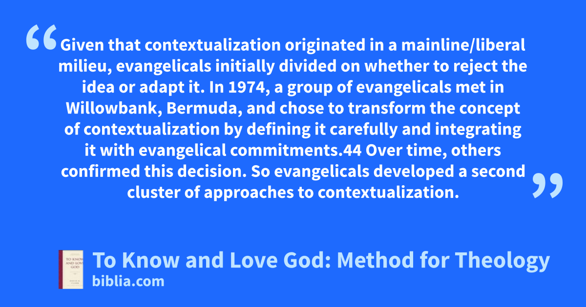 Given that contextualization originated in a mainline/liberal milieu, evangelicals initially divided on whether to reject the idea or adapt it. In 1974, a group of evangelicals met in Willowbank, Bermuda, and chose to transform the concept of contextualization by defining it carefully and integrating it with evangelical commitments.44 Over time, others confirmed this decision. So evangelicals developed a second cluster of approaches to contextualization.