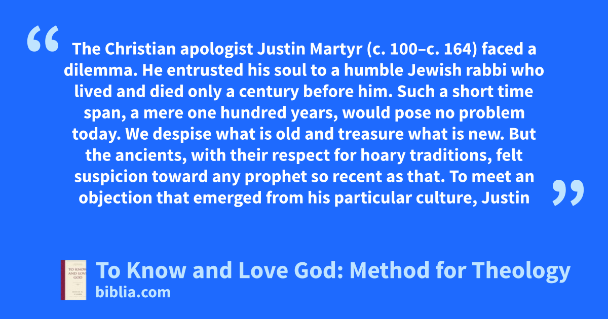 The Christian apologist Justin Martyr (c. 100–c. 164) faced a dilemma. He entrusted his soul to a humble Jewish rabbi who lived and died only a century before him. Such a short time span, a mere one hundred years, would pose no problem today. We despise what is old and treasure what is new. But the ancients, with their respect for hoary traditions, felt suspicion toward any prophet so recent as that. To meet an objection that emerged from his particular culture, Justin