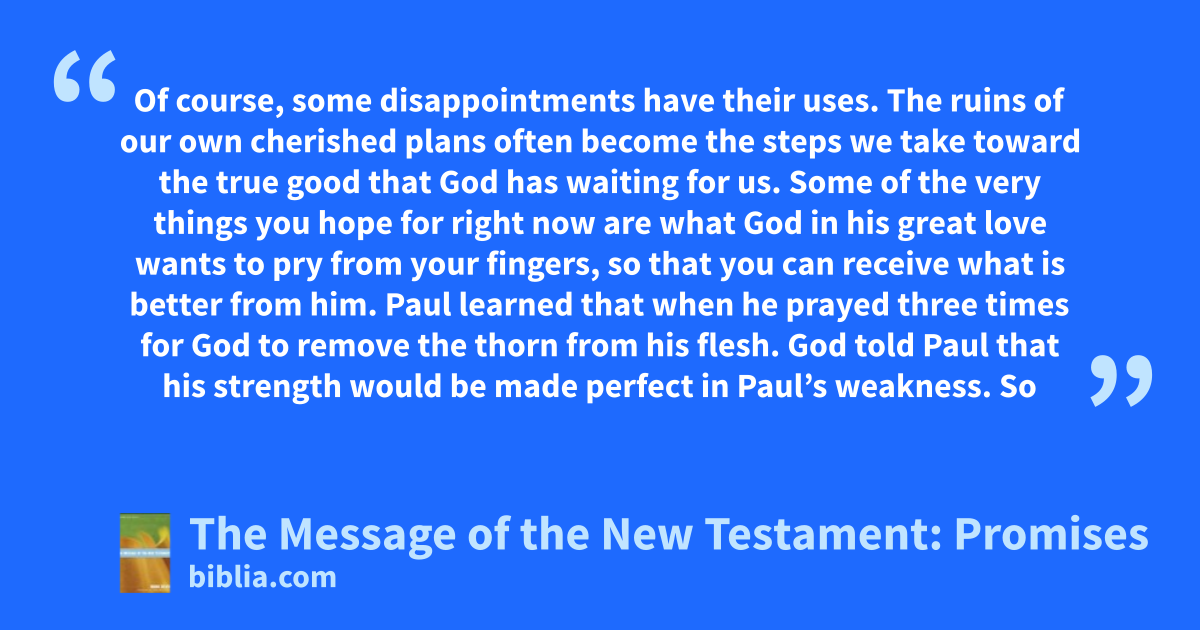 Of course, some disappointments have their uses. The ruins of our own cherished plans often become the steps we take toward the true good that God has waiting for us. Some of the very things you hope for right now are what God in his great love wants to pry from your fingers, so that you can receive what is better from him. Paul learned that when he prayed three times for God to remove the thorn from his flesh. God told Paul that his strength would be made perfect in Paul’s weakness. So