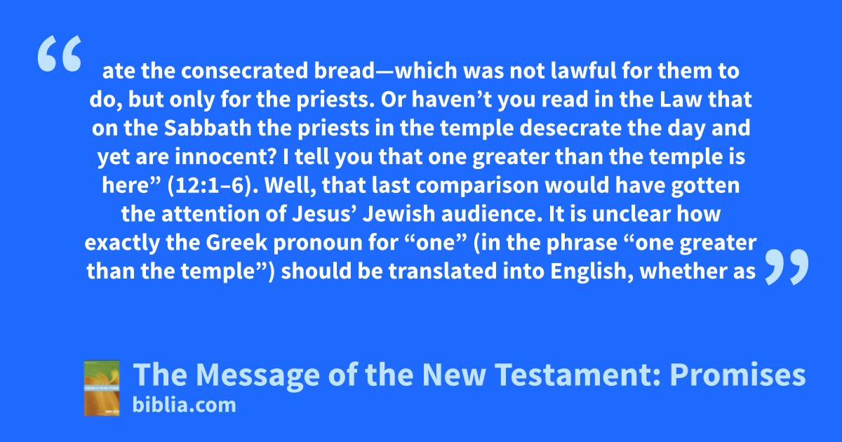 ate the consecrated bread—which was not lawful for them to do, but only for the priests. Or haven’t you read in the Law that on the Sabbath the priests in the temple desecrate the day and yet are innocent? I tell you that one greater than the temple is here” (12:1–6). Well, that last comparison would have gotten the attention of Jesus’ Jewish audience. It is unclear how exactly the Greek pronoun for “one” (in the phrase “one greater than the temple”) should be translated into English, whether as