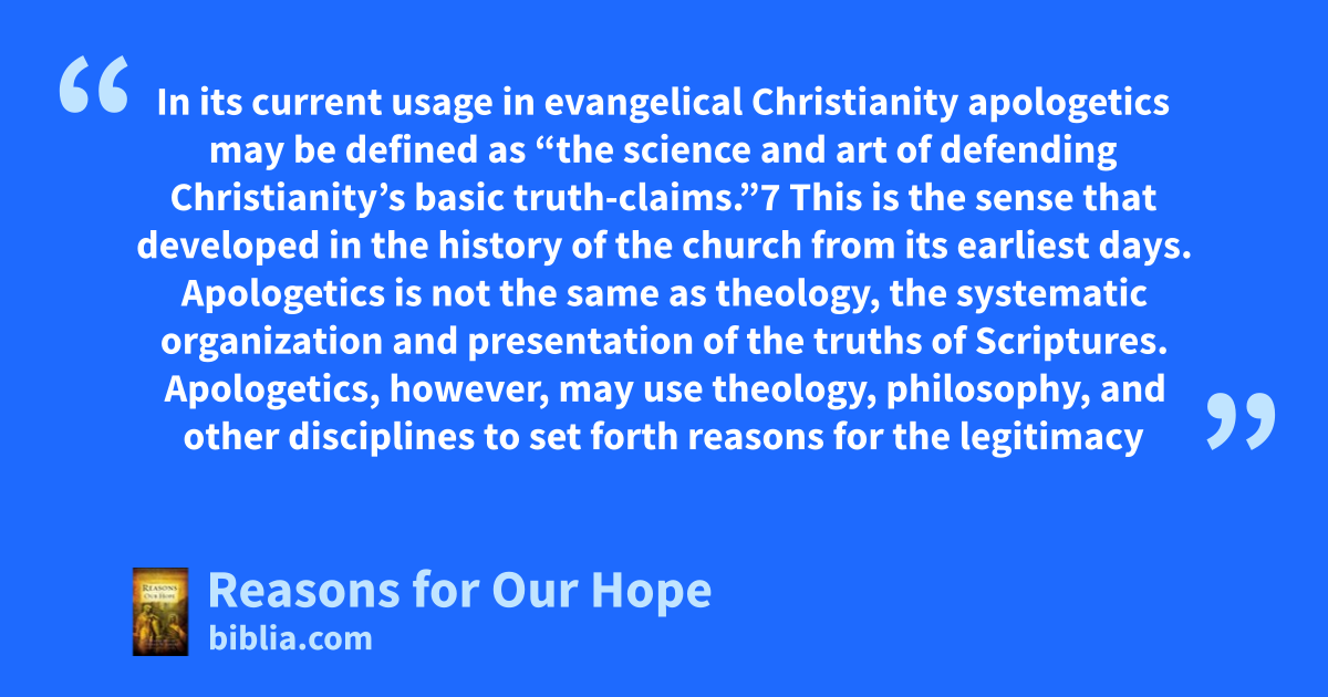 In its current usage in evangelical Christianity apologetics may be defined as “the science and art of defending Christianity’s basic truth-claims.”7 This is the sense that developed in the history of the church from its earliest days. Apologetics is not the same as theology, the systematic organization and presentation of the truths of Scriptures. Apologetics, however, may use theology, philosophy, and other disciplines to set forth reasons for the legitimacy