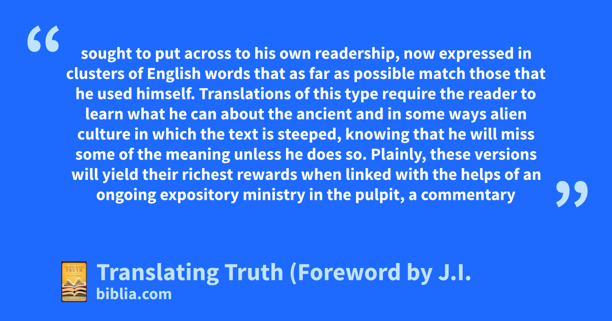 sought to put across to his own readership, now expressed in clusters of English words that as far as possible match those that he used himself. Translations of this type require the reader to learn what he can about the ancient and in some ways alien culture in which the text is steeped, knowing that he will miss some of the meaning unless he does so. Plainly, these versions will yield their richest rewards when linked with the helps of an ongoing expository ministry in the pulpit, a commentary