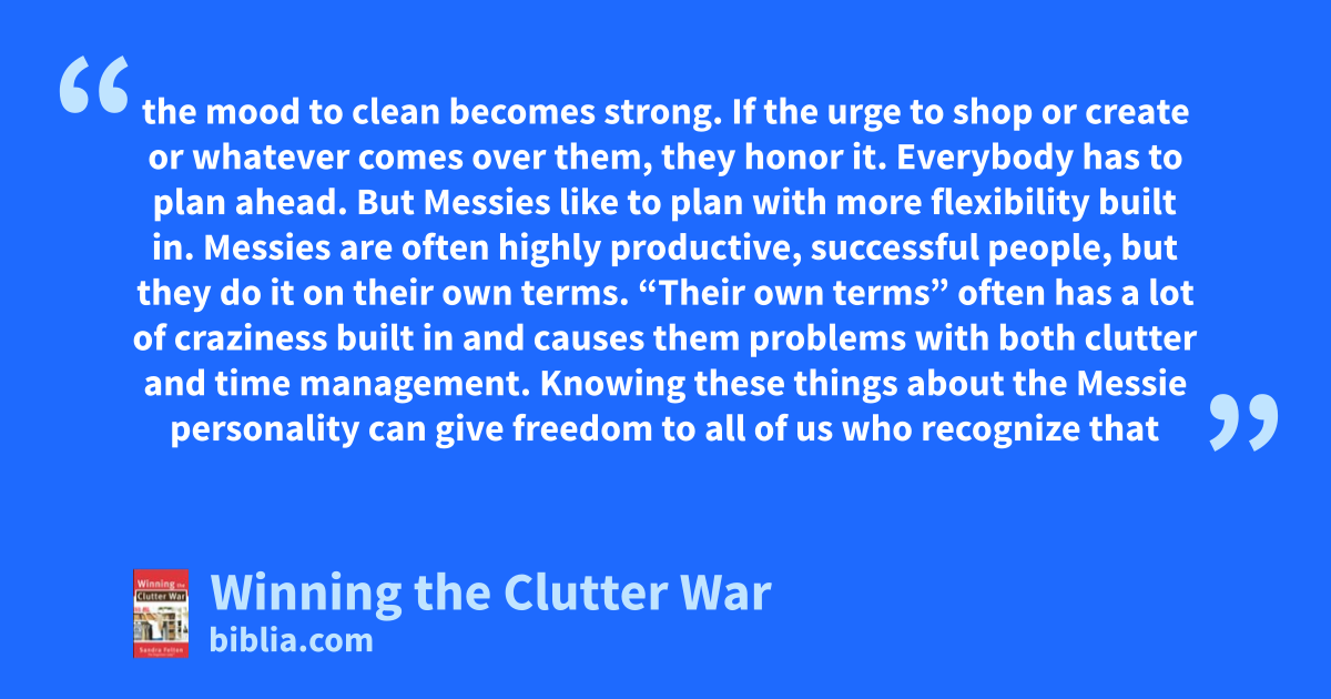 the mood to clean becomes strong. If the urge to shop or create or whatever comes over them, they honor it. Everybody has to plan ahead. But Messies like to plan with more flexibility built in. Messies are often highly productive, successful people, but they do it on their own terms. “Their own terms” often has a lot of craziness built in and causes them problems with both clutter and time management. Knowing these things about the Messie personality can give freedom to all of us who recognize that
