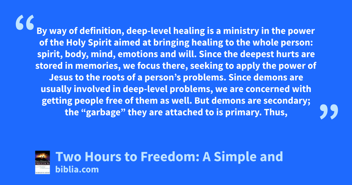 By way of definition, deep-level healing is a ministry in the power of the Holy Spirit aimed at bringing healing to the whole person: spirit, body, mind, emotions and will. Since the deepest hurts are stored in memories, we focus there, seeking to apply the power of Jesus to the roots of a person’s problems. Since demons are usually involved in deep-level problems, we are concerned with getting people free of them as well. But demons are secondary; the “garbage” they are attached to is primary. Thus,