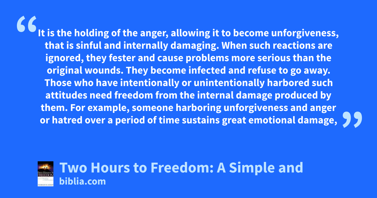 It is the holding of the anger, allowing it to become unforgiveness, that is sinful and internally damaging. When such reactions are ignored, they fester and cause problems more serious than the original wounds. They become infected and refuse to go away. Those who have intentionally or unintentionally harbored such attitudes need freedom from the internal damage produced by them. For example, someone harboring unforgiveness and anger or hatred over a period of time sustains great emotional damage,