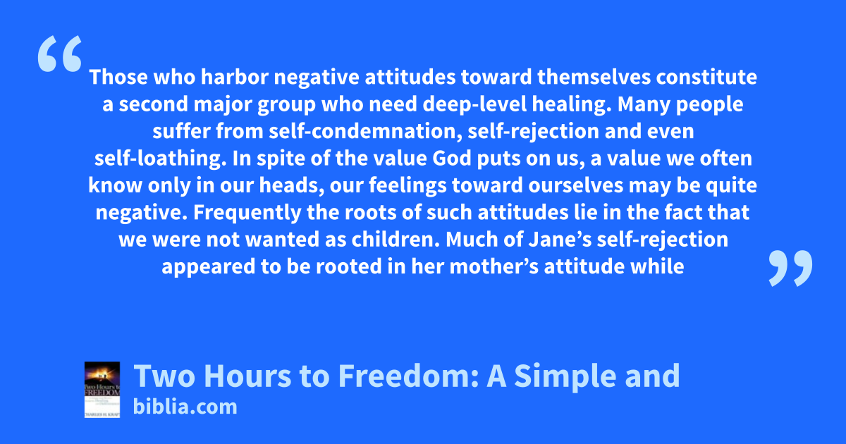 Those who harbor negative attitudes toward themselves constitute a second major group who need deep-level healing. Many people suffer from self-condemnation, self-rejection and even self-loathing. In spite of the value God puts on us, a value we often know only in our heads, our feelings toward ourselves may be quite negative. Frequently the roots of such attitudes lie in the fact that we were not wanted as children. Much of Jane’s self-rejection appeared to be rooted in her mother’s attitude while
