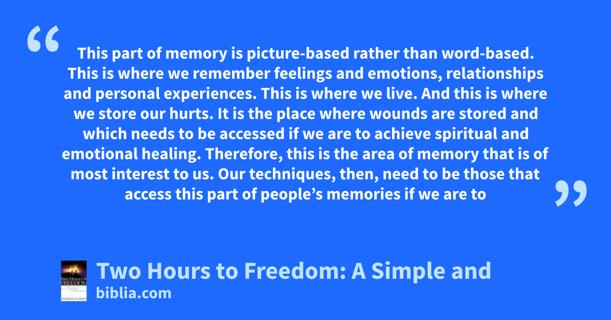 This part of memory is picture-based rather than word-based. This is where we remember feelings and emotions, relationships and personal experiences. This is where we live. And this is where we store our hurts. It is the place where wounds are stored and which needs to be accessed if we are to achieve spiritual and emotional healing. Therefore, this is the area of memory that is of most interest to us. Our techniques, then, need to be those that access this part of people’s memories if we are to