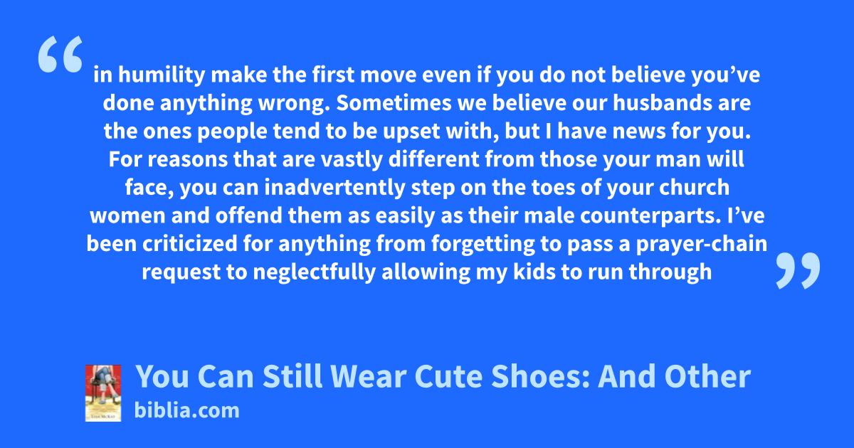 in humility make the first move even if you do not believe you’ve done anything wrong. Sometimes we believe our husbands are the ones people tend to be upset with, but I have news for you. For reasons that are vastly different from those your man will face, you can inadvertently step on the toes of your church women and offend them as easily as their male counterparts. I’ve been criticized for anything from forgetting to pass a prayer-chain request to neglectfully allowing my kids to run through