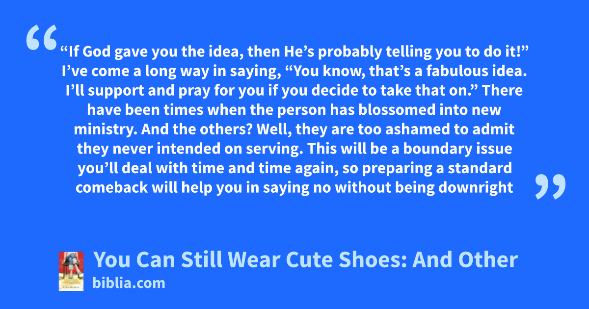 “If God gave you the idea, then He’s probably telling you to do it!” I’ve come a long way in saying, “You know, that’s a fabulous idea. I’ll support and pray for you if you decide to take that on.” There have been times when the person has blossomed into new ministry. And the others? Well, they are too ashamed to admit they never intended on serving. This will be a boundary issue you’ll deal with time and time again, so preparing a standard comeback will help you in saying no without being downright
