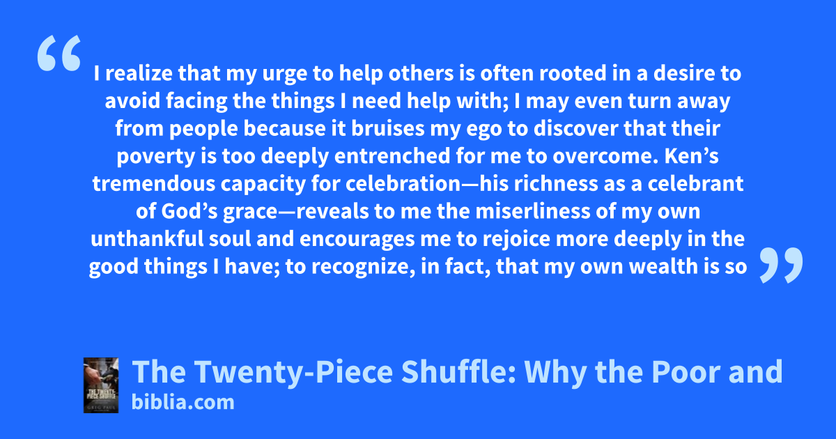 I realize that my urge to help others is often rooted in a desire to avoid facing the things I need help with; I may even turn away from people because it bruises my ego to discover that their poverty is too deeply entrenched for me to overcome. Ken’s tremendous capacity for celebration—his richness as a celebrant of God’s grace—reveals to me the miserliness of my own unthankful soul and encourages me to rejoice more deeply in the good things I have; to recognize, in fact, that my own wealth is so