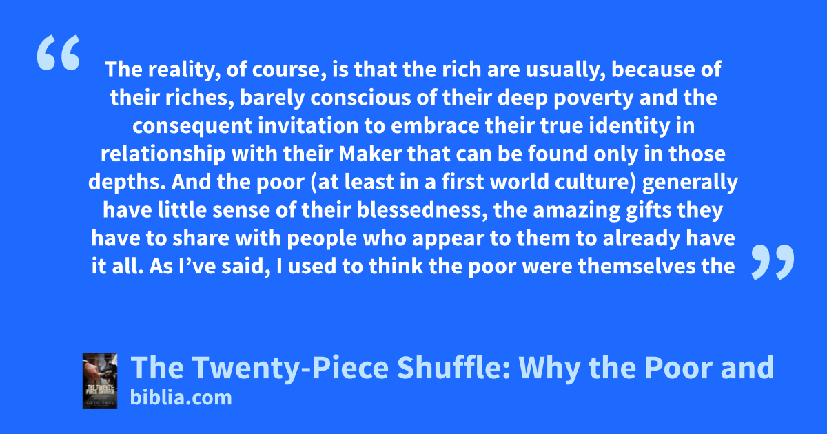 The reality, of course, is that the rich are usually, because of their riches, barely conscious of their deep poverty and the consequent invitation to embrace their true identity in relationship with their Maker that can be found only in those depths. And the poor (at least in a first world culture) generally have little sense of their blessedness, the amazing gifts they have to share with people who appear to them to already have it all. As I’ve said, I used to think the poor were themselves the
