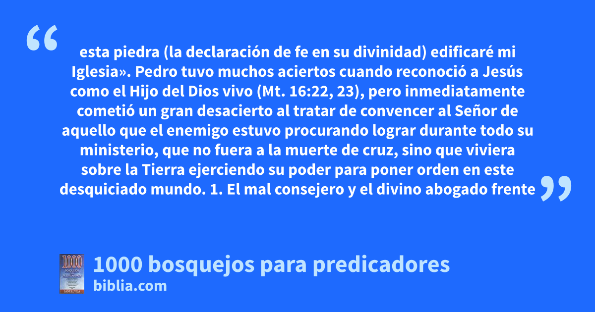 esta piedra (la declaración de fe en su divinidad) edificaré mi Iglesia». Pedro tuvo muchos aciertos cuando reconoció a Jesús como el Hijo del Dios vivo (Mt. 16:22, 23), pero inmediatamente cometió un gran desacierto al tratar de convencer al Señor de aquello que el enemigo estuvo procurando lograr durante todo su ministerio, que no fuera a la muerte de cruz, sino que viviera sobre la Tierra ejerciendo su poder para poner orden en este desquiciado mundo. 1. El mal consejero y el divino abogado frente