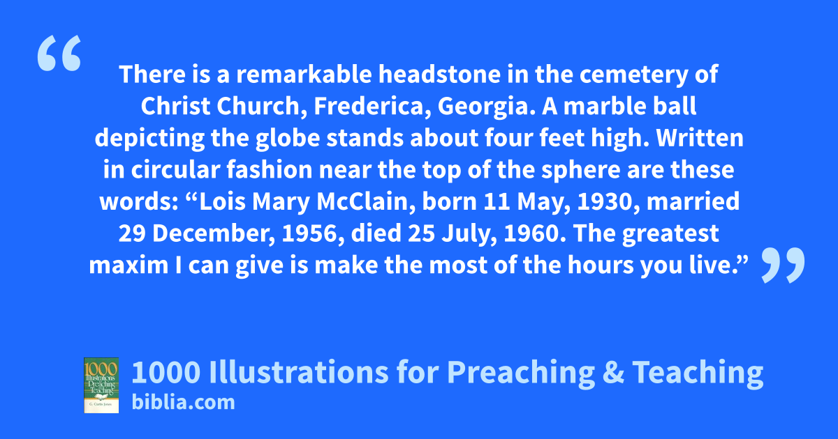 There is a remarkable headstone in the cemetery of Christ Church, Frederica, Georgia. A marble ball depicting the globe stands about four feet high. Written in circular fashion near the top of the sphere are these words: “Lois Mary McClain, born 11 May, 1930, married 29 December, 1956, died 25 July, 1960. The greatest maxim I can give is make the most of the hours you live.”