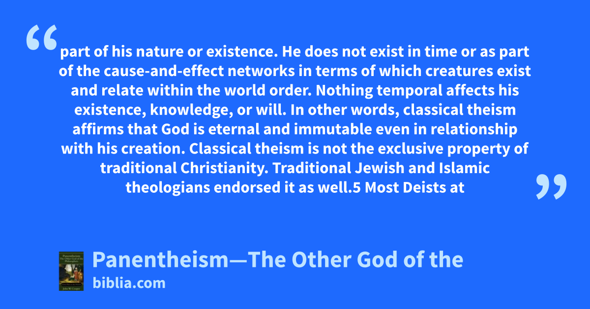 part of his nature or existence. He does not exist in time or as part of the cause-and-effect networks in terms of which creatures exist and relate within the world order. Nothing temporal affects his existence, knowledge, or will. In other words, classical theism affirms that God is eternal and immutable even in relationship with his creation. Classical theism is not the exclusive property of traditional Christianity. Traditional Jewish and Islamic theologians endorsed it as well.5 Most Deists at