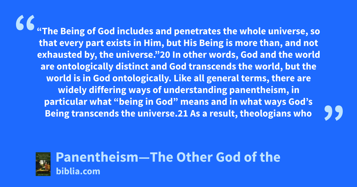 “The Being of God includes and penetrates the whole universe, so that every part exists in Him, but His Being is more than, and not exhausted by, the universe.”20 In other words, God and the world are ontologically distinct and God transcends the world, but the world is in God ontologically. Like all general terms, there are widely differing ways of understanding panentheism, in particular what “being in God” means and in what ways God’s Being transcends the universe.21 As a result, theologians who