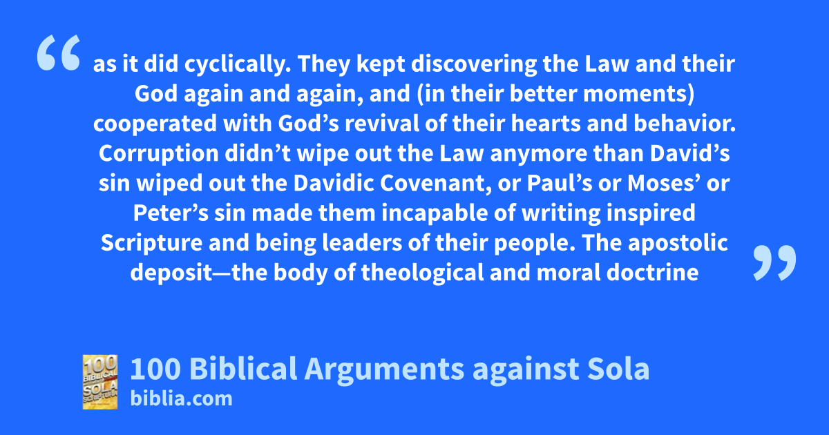 as it did cyclically. They kept discovering the Law and their God again and again, and (in their better moments) cooperated with God’s revival of their hearts and behavior. Corruption didn’t wipe out the Law anymore than David’s sin wiped out the Davidic Covenant, or Paul’s or Moses’ or Peter’s sin made them incapable of writing inspired Scripture and being leaders of their people. The apostolic deposit—the body of theological and moral doctrine