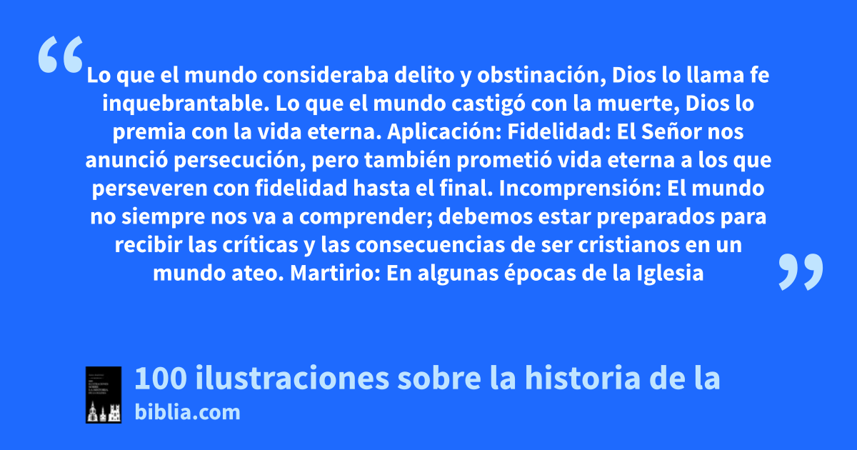 Lo que el mundo consideraba delito y obstinación, Dios lo llama fe inquebrantable. Lo que el mundo castigó con la muerte, Dios lo premia con la vida eterna. Aplicación: Fidelidad: El Señor nos anunció persecución, pero también prometió vida eterna a los que perseveren con fidelidad hasta el final. Incomprensión: El mundo no siempre nos va a comprender; debemos estar preparados para recibir las críticas y las consecuencias de ser cristianos en un mundo ateo. Martirio: En algunas épocas de la Iglesia