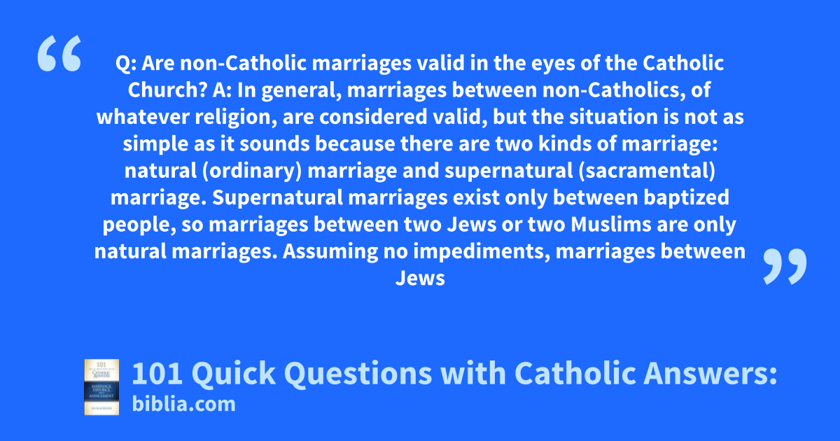 Q: Are non-Catholic marriages valid in the eyes of the Catholic Church? A: In general, marriages between non-Catholics, of whatever religion, are considered valid, but the situation is not as simple as it sounds because there are two kinds of marriage: natural (ordinary) marriage and supernatural (sacramental) marriage. Supernatural marriages exist only between baptized people, so marriages between two Jews or two Muslims are only natural marriages. Assuming no impediments, marriages between Jews