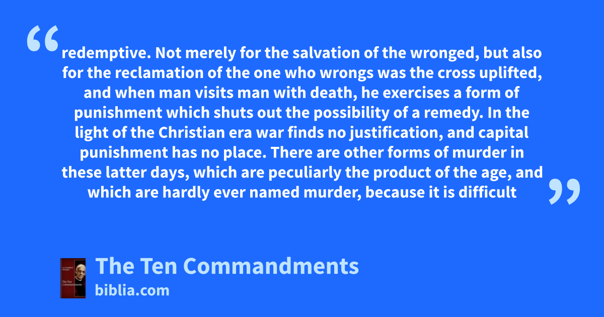 redemptive. Not merely for the salvation of the wronged, but also for the reclamation of the one who wrongs was the cross uplifted, and when man visits man with death, he exercises a form of punishment which shuts out the possibility of a remedy. In the light of the Christian era war finds no justification, and capital punishment has no place. There are other forms of murder in these latter days, which are peculiarly the product of the age, and which are hardly ever named murder, because it is difficult