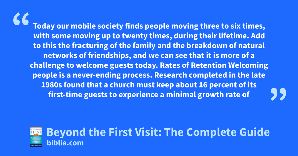 Today our mobile society finds people moving three to six times, with some moving up to twenty times, during their lifetime. Add to this the fracturing of the family and the breakdown of natural networks of friendships, and we can see that it is more of a challenge to welcome guests today. Rates of Retention Welcoming people is a never-ending process. Research completed in the late 1980s found that a church must keep about 16 percent of its first-time guests to experience a minimal growth rate of