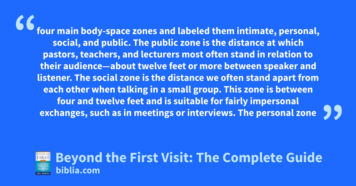 four main body-space zones and labeled them intimate, personal, social, and public. The public zone is the distance at which pastors, teachers, and lecturers most often stand in relation to their audience—about twelve feet or more between speaker and listener. The social zone is the distance we often stand apart from each other when talking in a small group. This zone is between four and twelve feet and is suitable for fairly impersonal exchanges, such as in meetings or interviews. The personal zone
