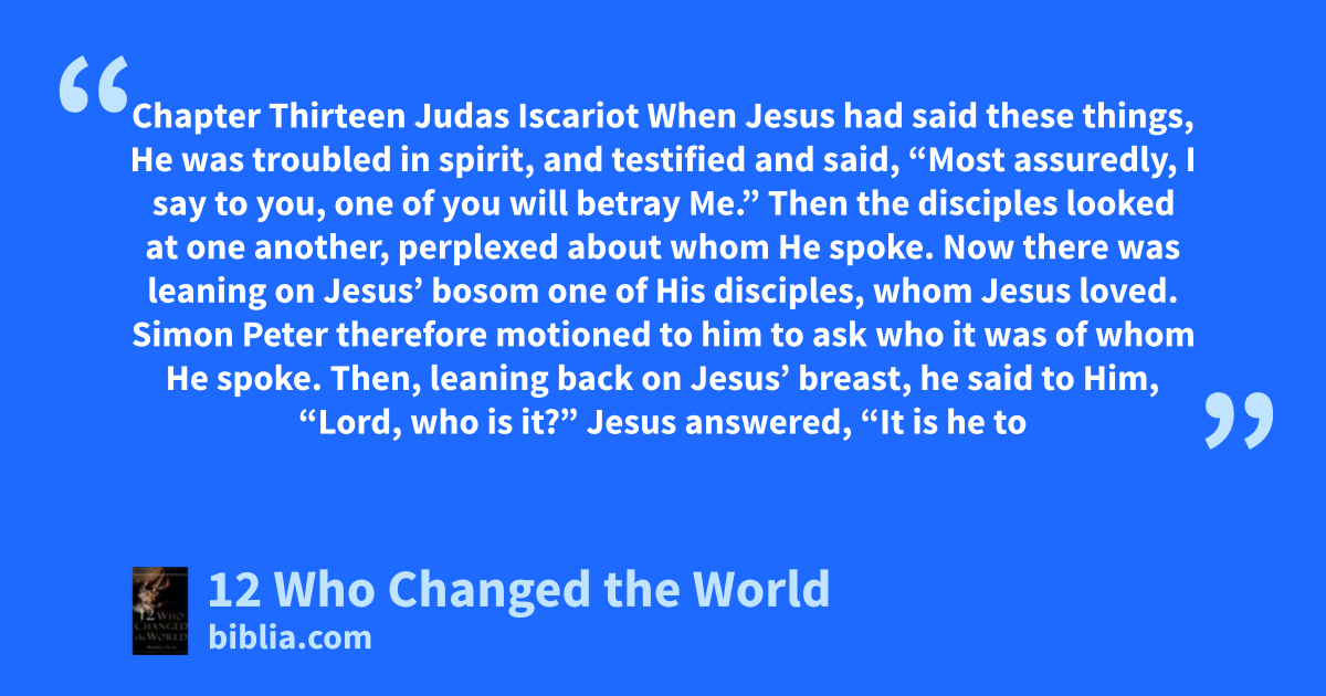 Chapter Thirteen Judas Iscariot When Jesus had said these things, He was troubled in spirit, and testified and said, “Most assuredly, I say to you, one of you will betray Me.” Then the disciples looked at one another, perplexed about whom He spoke. Now there was leaning on Jesus’ bosom one of His disciples, whom Jesus loved. Simon Peter therefore motioned to him to ask who it was of whom He spoke. Then, leaning back on Jesus’ breast, he said to Him, “Lord, who is it?” Jesus answered, “It is he to