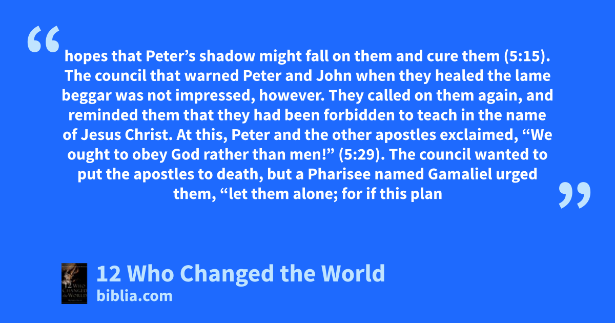 hopes that Peter’s shadow might fall on them and cure them (5:15). The council that warned Peter and John when they healed the lame beggar was not impressed, however. They called on them again, and reminded them that they had been forbidden to teach in the name of Jesus Christ. At this, Peter and the other apostles exclaimed, “We ought to obey God rather than men!” (5:29). The council wanted to put the apostles to death, but a Pharisee named Gamaliel urged them, “let them alone; for if this plan