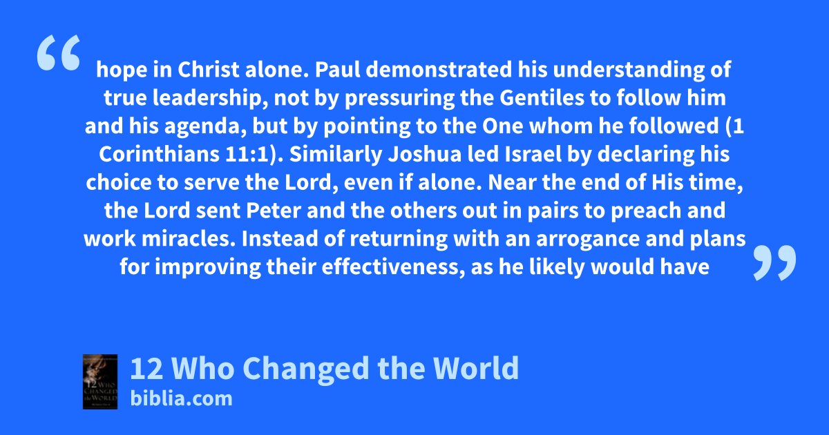 hope in Christ alone. Paul demonstrated his understanding of true leadership, not by pressuring the Gentiles to follow him and his agenda, but by pointing to the One whom he followed (1 Corinthians 11:1). Similarly Joshua led Israel by declaring his choice to serve the Lord, even if alone. Near the end of His time, the Lord sent Peter and the others out in pairs to preach and work miracles. Instead of returning with an arrogance and plans for improving their effectiveness, as he likely would have