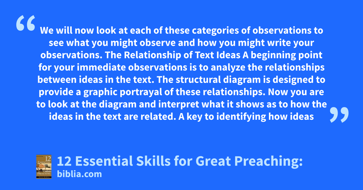 We will now look at each of these categories of observations to see what you might observe and how you might write your observations. The Relationship of Text Ideas A beginning point for your immediate observations is to analyze the relationships between ideas in the text. The structural diagram is designed to provide a graphic portrayal of these relationships. Now you are to look at the diagram and interpret what it shows as to how the ideas in the text are related. A key to identifying how ideas