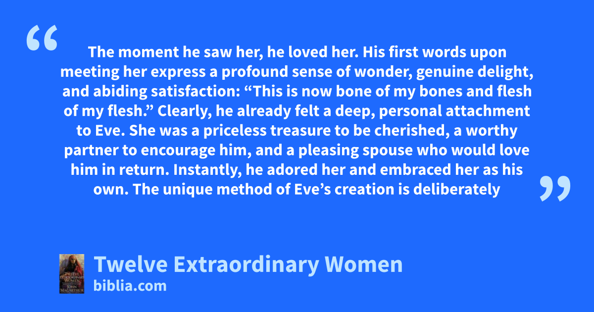 The moment he saw her, he loved her. His first words upon meeting her express a profound sense of wonder, genuine delight, and abiding satisfaction: “This is now bone of my bones and flesh of my flesh.” Clearly, he already felt a deep, personal attachment to Eve. She was a priceless treasure to be cherished, a worthy partner to encourage him, and a pleasing spouse who would love him in return. Instantly, he adored her and embraced her as his own. The unique method of Eve’s creation is deliberately