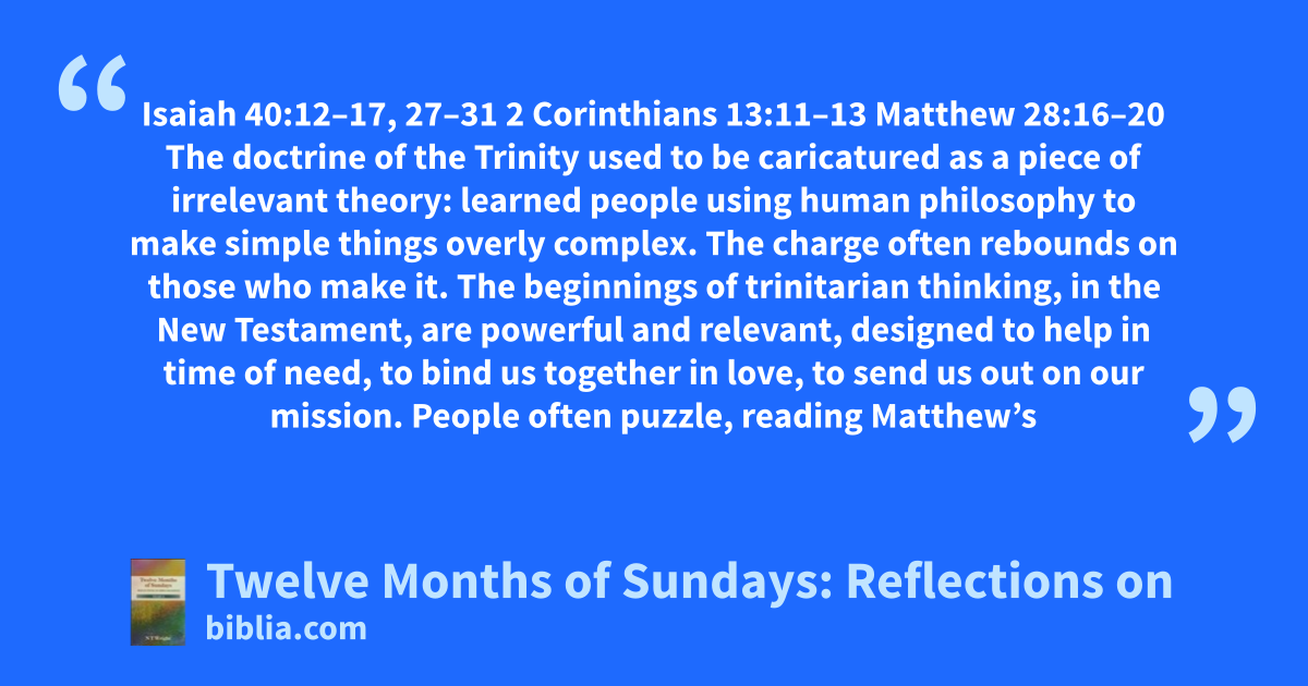 Isaiah 40:12–17, 27–31 2 Corinthians 13:11–13 Matthew 28:16–20 The doctrine of the Trinity used to be caricatured as a piece of irrelevant theory: learned people using human philosophy to make simple things overly complex. The charge often rebounds on those who make it. The beginnings of trinitarian thinking, in the New Testament, are powerful and relevant, designed to help in time of need, to bind us together in love, to send us out on our mission. People often puzzle, reading Matthew’s