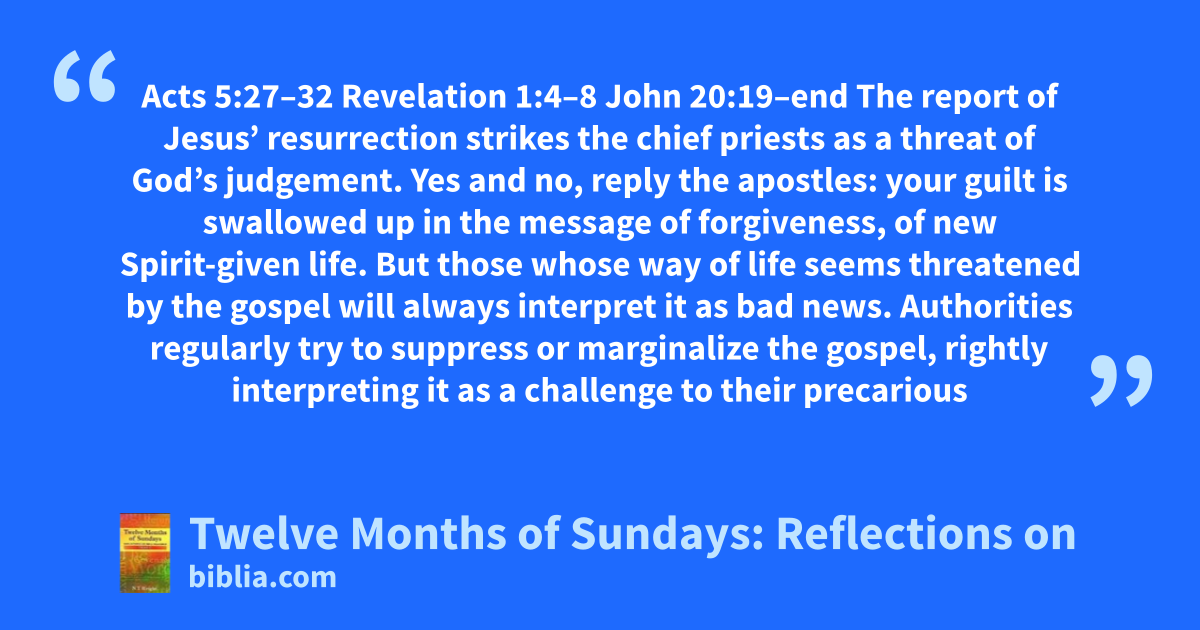 Acts 5:27–32 Revelation 1:4–8 John 20:19–end The report of Jesus’ resurrection strikes the chief priests as a threat of God’s judgement. Yes and no, reply the apostles: your guilt is swallowed up in the message of forgiveness, of new Spirit-given life. But those whose way of life seems threatened by the gospel will always interpret it as bad news. Authorities regularly try to suppress or marginalize the gospel, rightly interpreting it as a challenge to their precarious