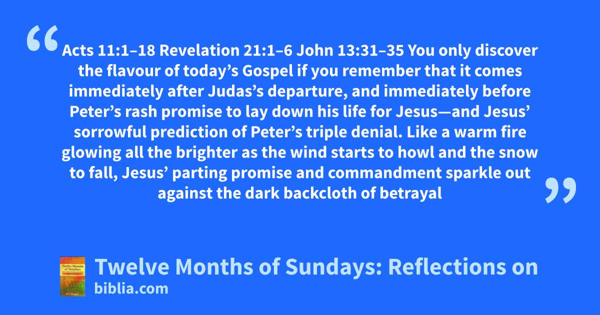 Acts 11:1–18 Revelation 21:1–6 John 13:31–35 You only discover the flavour of today’s Gospel if you remember that it comes immediately after Judas’s departure, and immediately before Peter’s rash promise to lay down his life for Jesus—and Jesus’ sorrowful prediction of Peter’s triple denial. Like a warm fire glowing all the brighter as the wind starts to howl and the snow to fall, Jesus’ parting promise and commandment sparkle out against the dark backcloth of betrayal