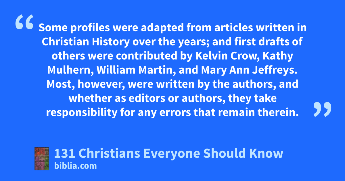 Some profiles were adapted from articles written in Christian History over the years; and first drafts of others were contributed by Kelvin Crow, Kathy Mulhern, William Martin, and Mary Ann Jeffreys. Most, however, were written by the authors, and whether as editors or authors, they take responsibility for any errors that remain therein.