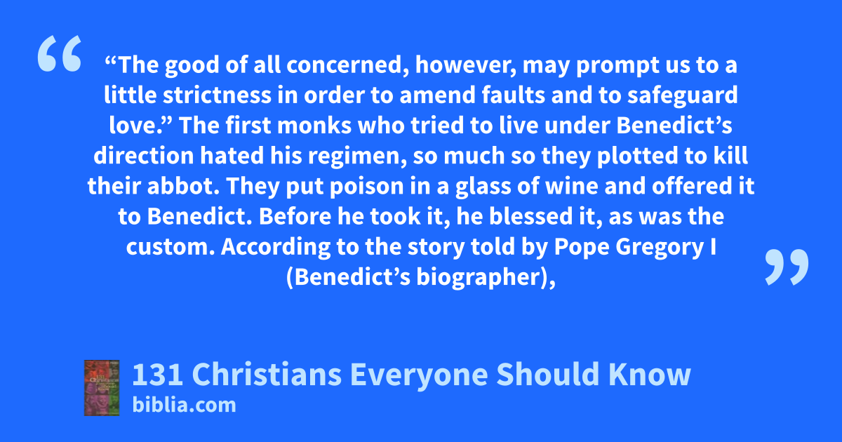 “The good of all concerned, however, may prompt us to a little strictness in order to amend faults and to safeguard love.” The first monks who tried to live under Benedict’s direction hated his regimen, so much so they plotted to kill their abbot. They put poison in a glass of wine and offered it to Benedict. Before he took it, he blessed it, as was the custom. According to the story told by Pope Gregory I (Benedict’s biographer),