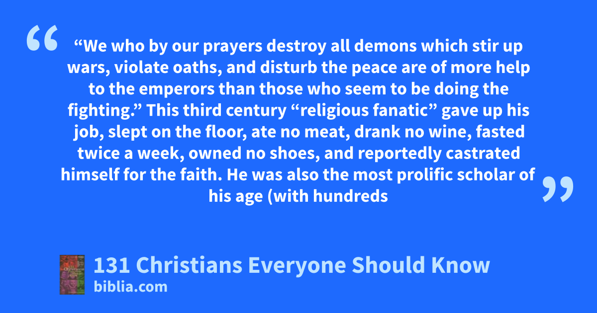 “We who by our prayers destroy all demons which stir up wars, violate oaths, and disturb the peace are of more help to the emperors than those who seem to be doing the fighting.” This third century “religious fanatic” gave up his job, slept on the floor, ate no meat, drank no wine, fasted twice a week, owned no shoes, and reportedly castrated himself for the faith. He was also the most prolific scholar of his age (with hundreds