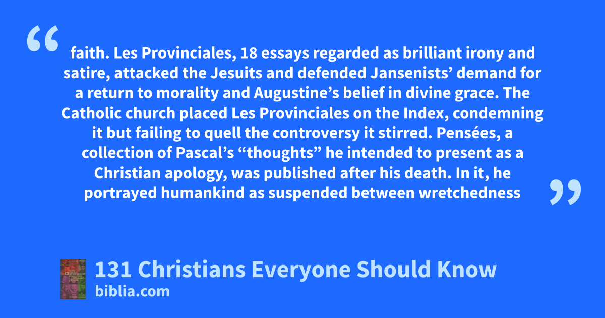 faith. Les Provinciales, 18 essays regarded as brilliant irony and satire, attacked the Jesuits and defended Jansenists’ demand for a return to morality and Augustine’s belief in divine grace. The Catholic church placed Les Provinciales on the Index, condemning it but failing to quell the controversy it stirred. Pensées, a collection of Pascal’s “thoughts” he intended to present as a Christian apology, was published after his death. In it, he portrayed humankind as suspended between wretchedness