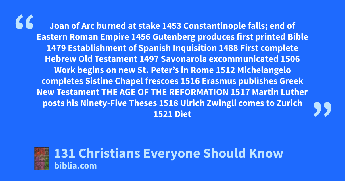 Joan of Arc burned at stake 1453 Constantinople falls; end of Eastern Roman Empire 1456 Gutenberg produces first printed Bible 1479 Establishment of Spanish Inquisition 1488 First complete Hebrew Old Testament 1497 Savonarola excommunicated 1506 Work begins on new St. Peter’s in Rome 1512 Michelangelo completes Sistine Chapel frescoes 1516 Erasmus publishes Greek New Testament THE AGE OF THE REFORMATION 1517 Martin Luther posts his Ninety-Five Theses 1518 Ulrich Zwingli comes to Zurich 1521 Diet