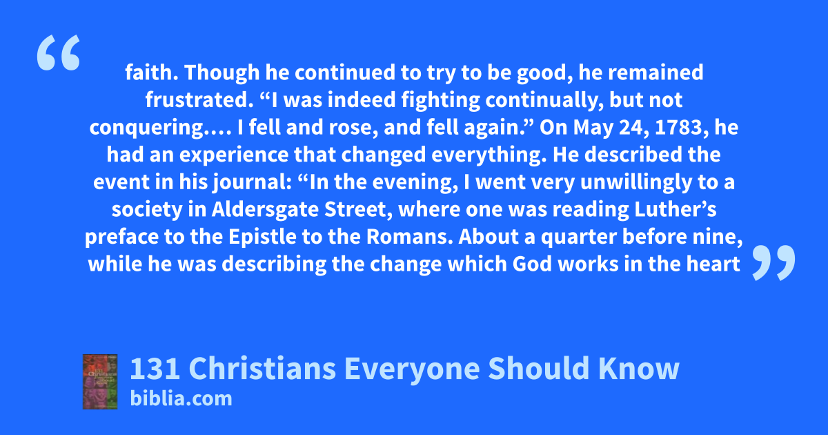 faith. Though he continued to try to be good, he remained frustrated. “I was indeed fighting continually, but not conquering.… I fell and rose, and fell again.” On May 24, 1783, he had an experience that changed everything. He described the event in his journal: “In the evening, I went very unwillingly to a society in Aldersgate Street, where one was reading Luther’s preface to the Epistle to the Romans. About a quarter before nine, while he was describing the change which God works in the heart