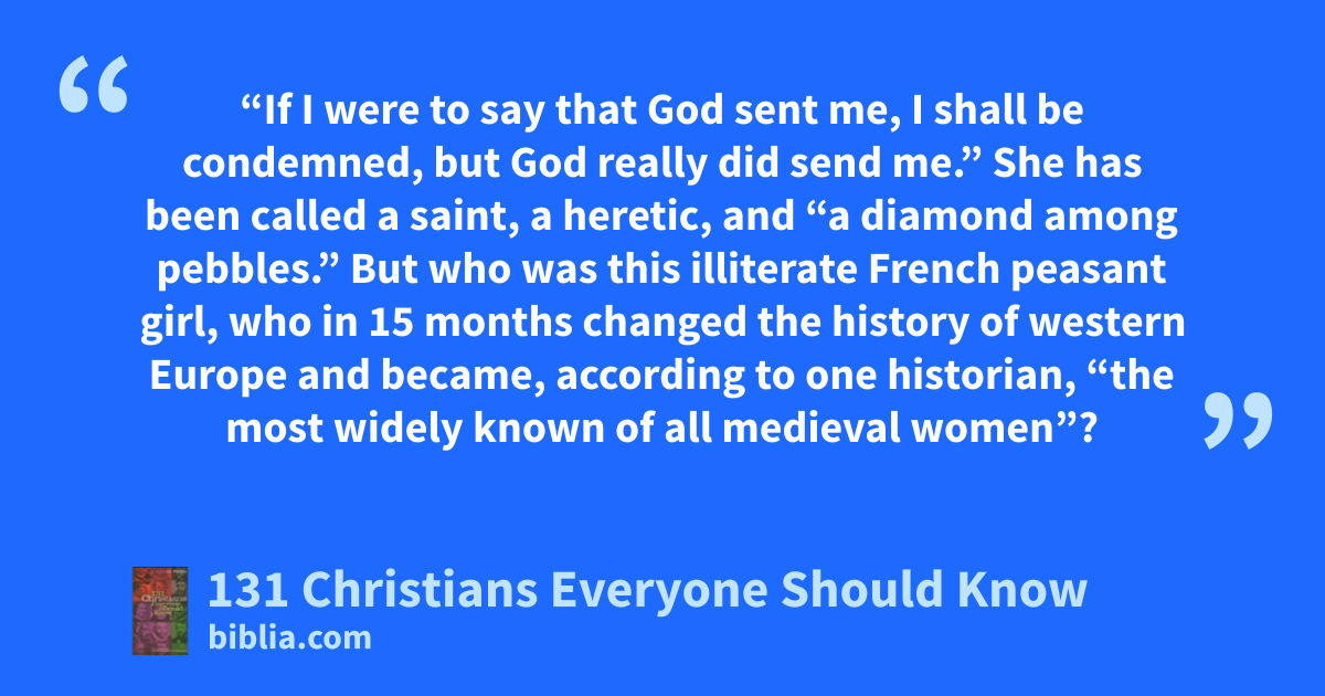 “If I were to say that God sent me, I shall be condemned, but God really did send me.” She has been called a saint, a heretic, and “a diamond among pebbles.” But who was this illiterate French peasant girl, who in 15 months changed the history of western Europe and became, according to one historian, “the most widely known of all medieval women”?