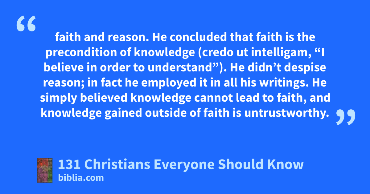 faith and reason. He concluded that faith is the precondition of knowledge (credo ut intelligam, “I believe in order to understand”). He didn’t despise reason; in fact he employed it in all his writings. He simply believed knowledge cannot lead to faith, and knowledge gained outside of faith is untrustworthy.