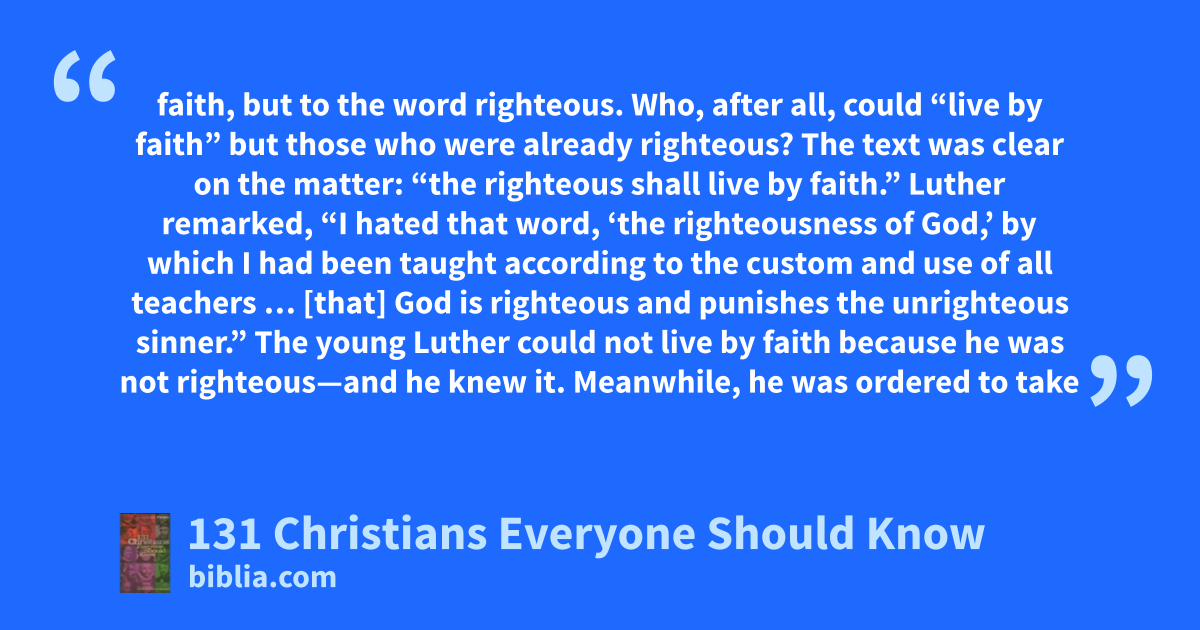 faith, but to the word righteous. Who, after all, could “live by faith” but those who were already righteous? The text was clear on the matter: “the righteous shall live by faith.” Luther remarked, “I hated that word, ‘the righteousness of God,’ by which I had been taught according to the custom and use of all teachers … [that] God is righteous and punishes the unrighteous sinner.” The young Luther could not live by faith because he was not righteous—and he knew it. Meanwhile, he was ordered to take
