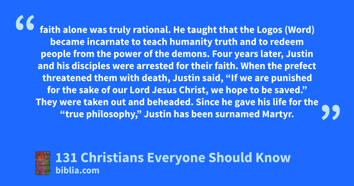faith alone was truly rational. He taught that the Logos (Word) became incarnate to teach humanity truth and to redeem people from the power of the demons. Four years later, Justin and his disciples were arrested for their faith. When the prefect threatened them with death, Justin said, “If we are punished for the sake of our Lord Jesus Christ, we hope to be saved.” They were taken out and beheaded. Since he gave his life for the “true philosophy,” Justin has been surnamed Martyr.