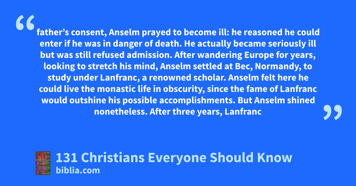 father’s consent, Anselm prayed to become ill: he reasoned he could enter if he was in danger of death. He actually became seriously ill but was still refused admission. After wandering Europe for years, looking to stretch his mind, Anselm settled at Bec, Normandy, to study under Lanfranc, a renowned scholar. Anselm felt here he could live the monastic life in obscurity, since the fame of Lanfranc would outshine his possible accomplishments. But Anselm shined nonetheless. After three years, Lanfranc