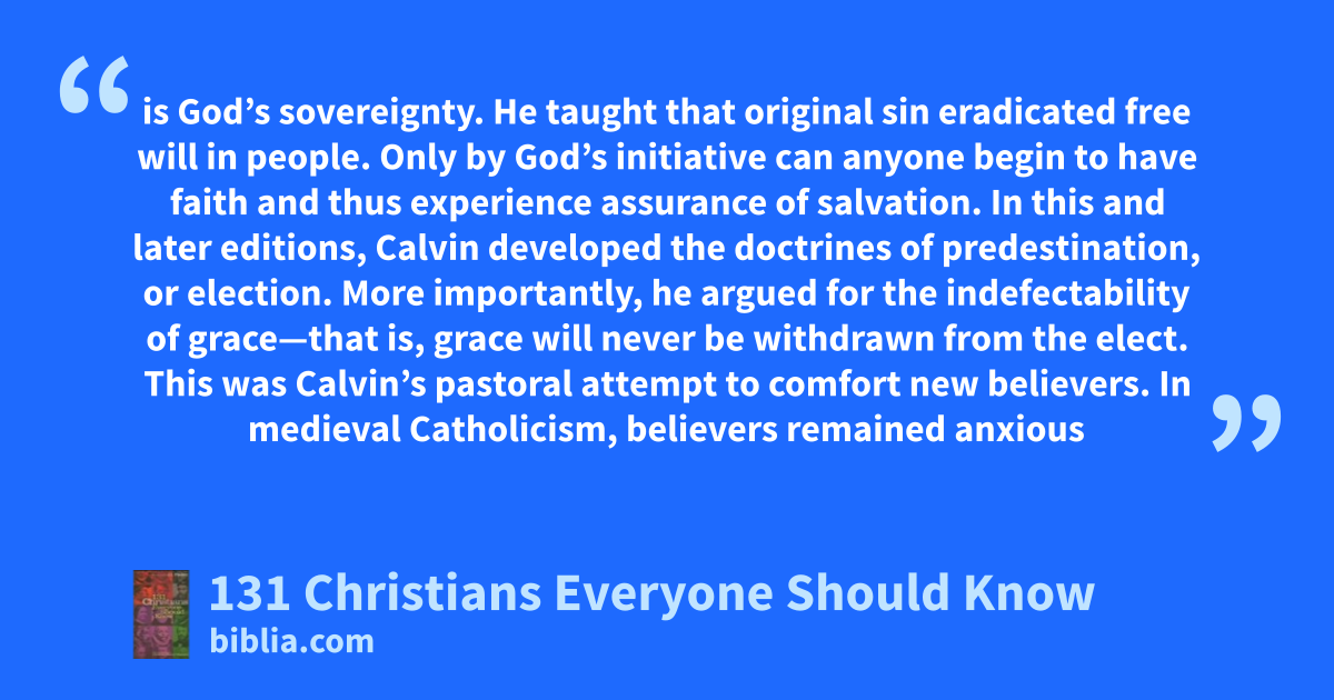 is God’s sovereignty. He taught that original sin eradicated free will in people. Only by God’s initiative can anyone begin to have faith and thus experience assurance of salvation. In this and later editions, Calvin developed the doctrines of predestination, or election. More importantly, he argued for the indefectability of grace—that is, grace will never be withdrawn from the elect. This was Calvin’s pastoral attempt to comfort new believers. In medieval Catholicism, believers remained anxious