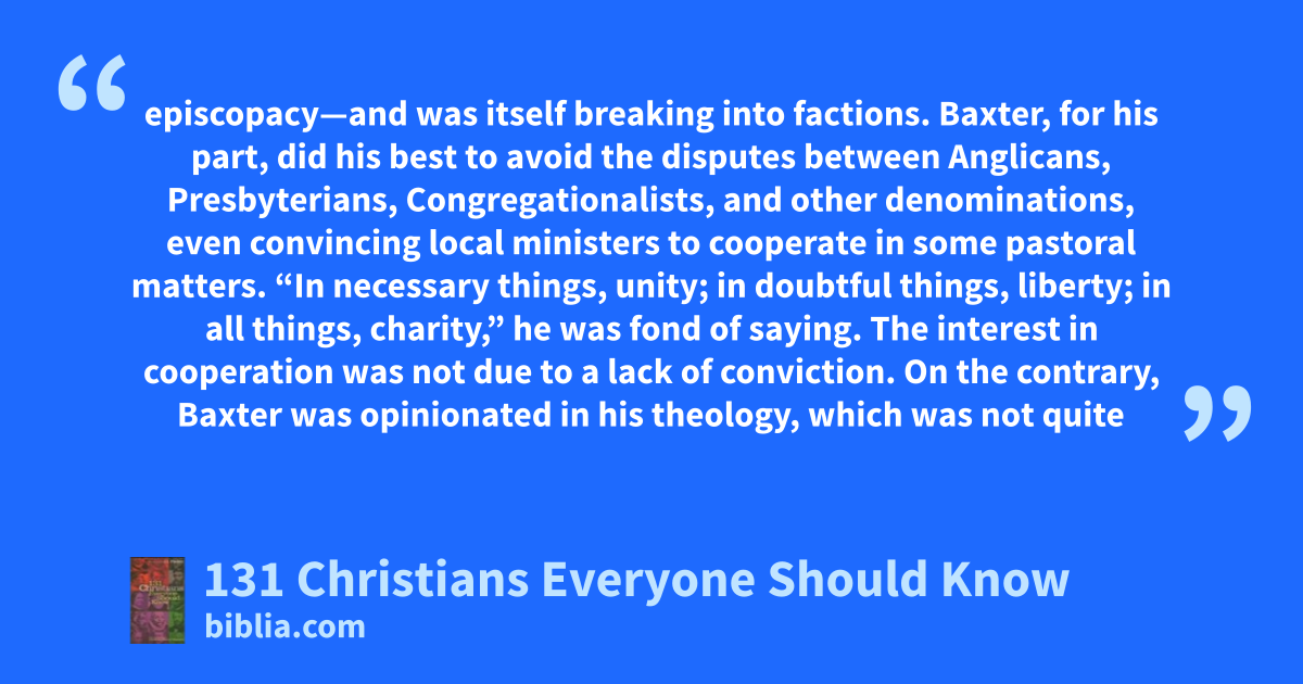episcopacy—and was itself breaking into factions. Baxter, for his part, did his best to avoid the disputes between Anglicans, Presbyterians, Congregationalists, and other denominations, even convincing local ministers to cooperate in some pastoral matters. “In necessary things, unity; in doubtful things, liberty; in all things, charity,” he was fond of saying. The interest in cooperation was not due to a lack of conviction. On the contrary, Baxter was opinionated in his theology, which was not quite
