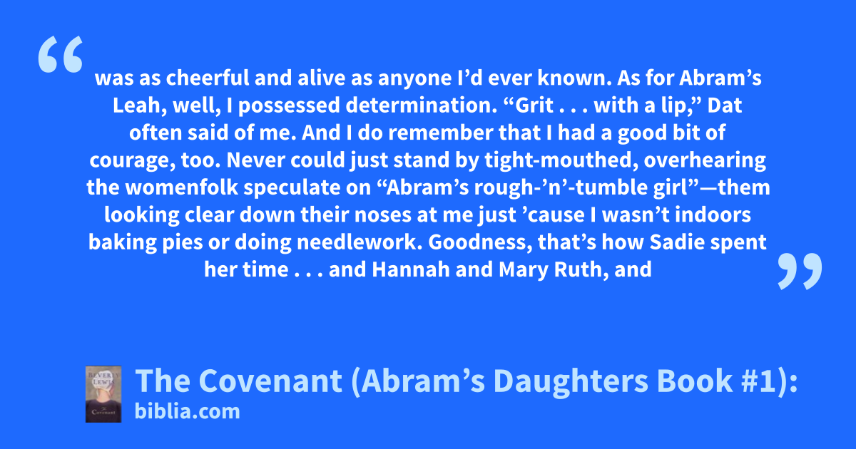 was as cheerful and alive as anyone I’d ever known. As for Abram’s Leah, well, I possessed determination. “Grit . . . with a lip,” Dat often said of me. And I do remember that I had a good bit of courage, too. Never could just stand by tight-mouthed, overhearing the womenfolk speculate on “Abram’s rough-’n’-tumble girl”—them looking clear down their noses at me just ’cause I wasn’t indoors baking pies or doing needlework. Goodness, that’s how Sadie spent her time . . . and Hannah and Mary Ruth, and