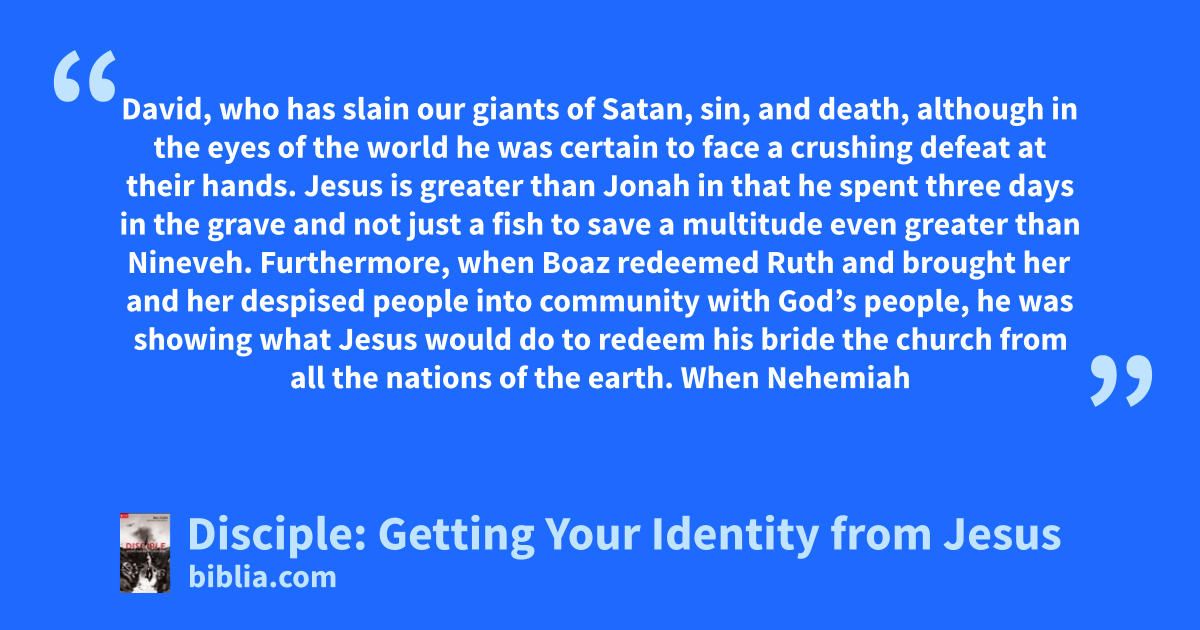 David, who has slain our giants of Satan, sin, and death, although in the eyes of the world he was certain to face a crushing defeat at their hands. Jesus is greater than Jonah in that he spent three days in the grave and not just a fish to save a multitude even greater than Nineveh. Furthermore, when Boaz redeemed Ruth and brought her and her despised people into community with God’s people, he was showing what Jesus would do to redeem his bride the church from all the nations of the earth. When Nehemiah