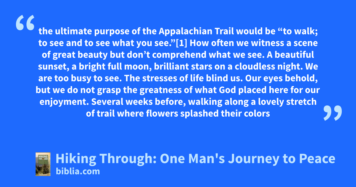 the ultimate purpose of the Appalachian Trail would be “to walk; to see and to see what you see.”[1] How often we witness a scene of great beauty but don’t comprehend what we see. A beautiful sunset, a bright full moon, brilliant stars on a cloudless night. We are too busy to see. The stresses of life blind us. Our eyes behold, but we do not grasp the greatness of what God placed here for our enjoyment. Several weeks before, walking along a lovely stretch of trail where flowers splashed their colors